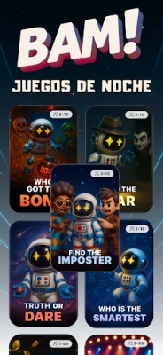 Desde el ingenio lingüístico hasta la mímica y la astucia social, BAM! amalgama una diversidad de géneros lúdicos en una sola plataforma. Ya sea una reunión familiar, un encuentro con amigos, o un momento de esparcimiento con compañeros de clase o colegas, la aplicación BAM! está diseñada para ser intuitiva y adaptable a cualquier grupo, convirtiendo cada encuentro en una aventura inolvidable. Sumérgete en el ingenio, reta a tus amigos, y llena tus veladas de estrategia, carcajadas y momentos verdaderamente memorables.