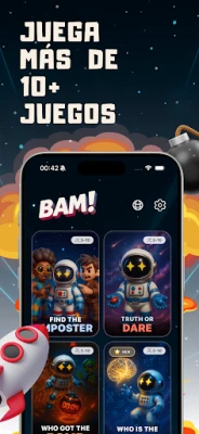 ¡BAM! es la app esencial para animar cualquier fiesta o reunión. Garantiza diversión instantánea y sin complicaciones, sin registros ni Wi-Fi. Perfecta para cumpleaños, reuniones familiares o como rompehielos rápido entre amigos.