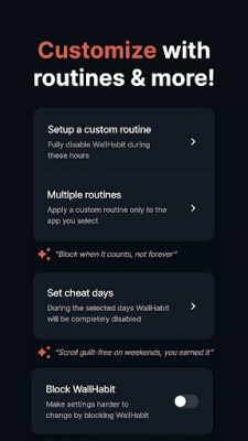 La eficacia de WallHabit reside en su aplicación inteligente de principios psicológicos, actuando como un "dispositivo de compromiso" que te ayuda a mantener tus objetivos. Al introducir una barrera física mínima antes del acceso, WallHabit interrumpe el patrón impulsivo, permitiéndote recuperar la claridad mental y el control. Esto se traduce en beneficios tangibles: desde la tan anhelada capacidad de bloquear los Reels de Instagram y los Shorts de YouTube sin renunciar a las plataformas, hasta la posibilidad de silenciar aplicaciones enteras o características específicas que minan tu atención. Es una herramienta diseñada para potenciar la concentración, ideal para quienes buscan combatir el desplazamiento sin fin ("doomscrolling") o mejorar la productividad, incluso para aquellos que lidian con el TDAH. Además, al prevenir el uso nocturno inconsciente, WallHabit es clave para asegurar un sueño reparador, sentando las bases para un día más enfocado y enérgico.